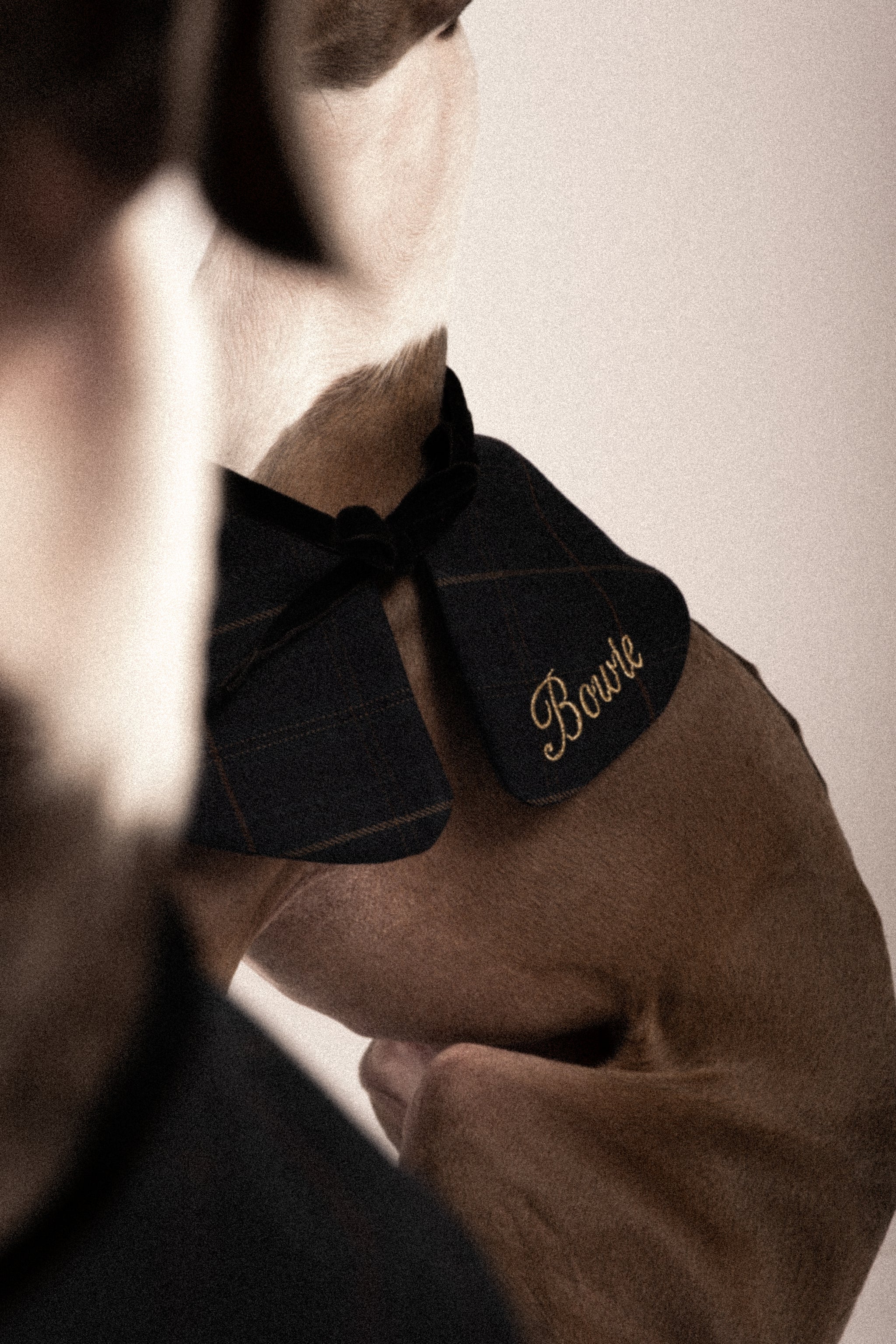 A timeless rounded collar in a deep green wool-blend plaid. A classic, heritage-inspired holiday palette. Designed to tie on comfortably for both pets and kids. Personalize it with an embroidered name or initials in gold thread for a keepsake touch.
