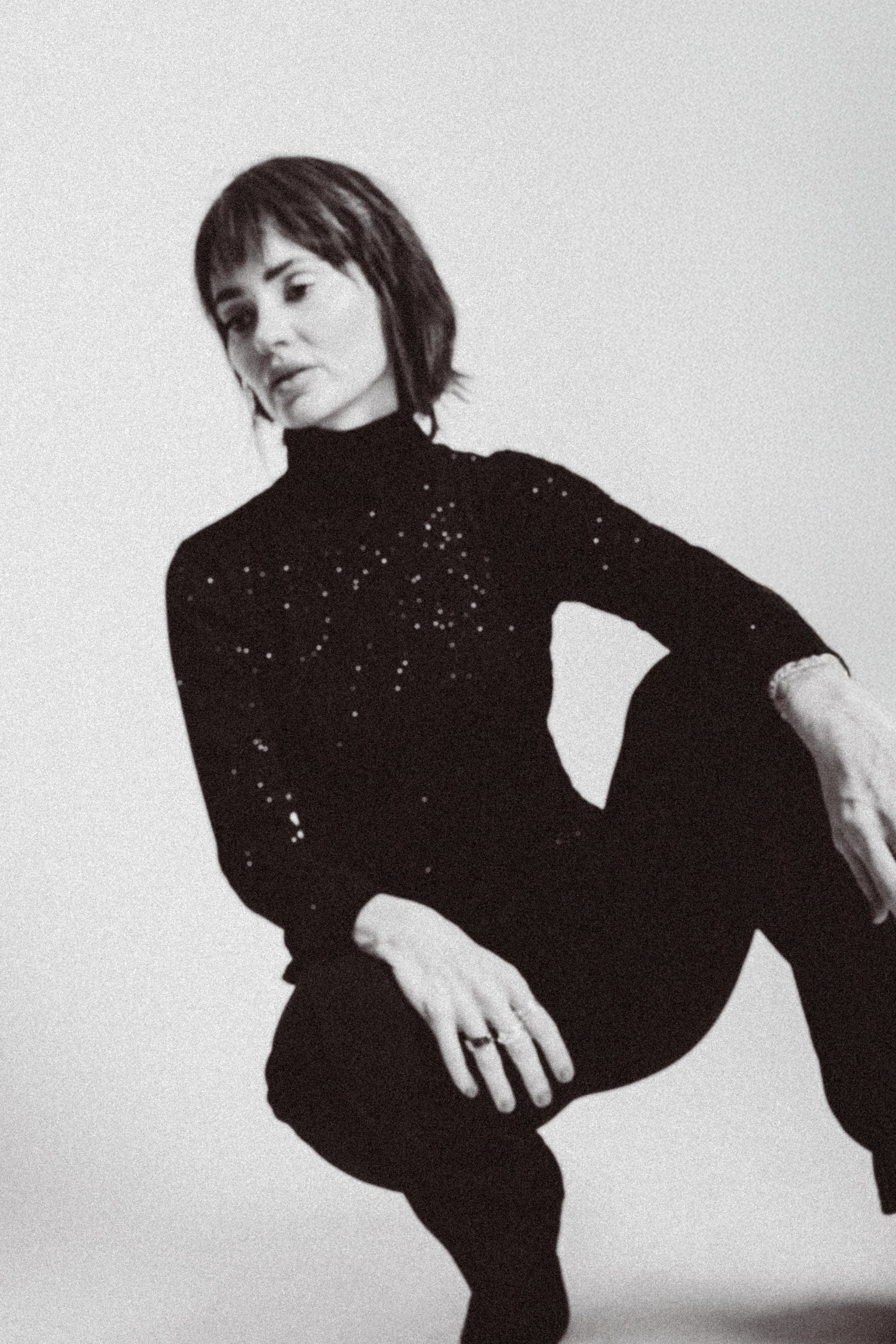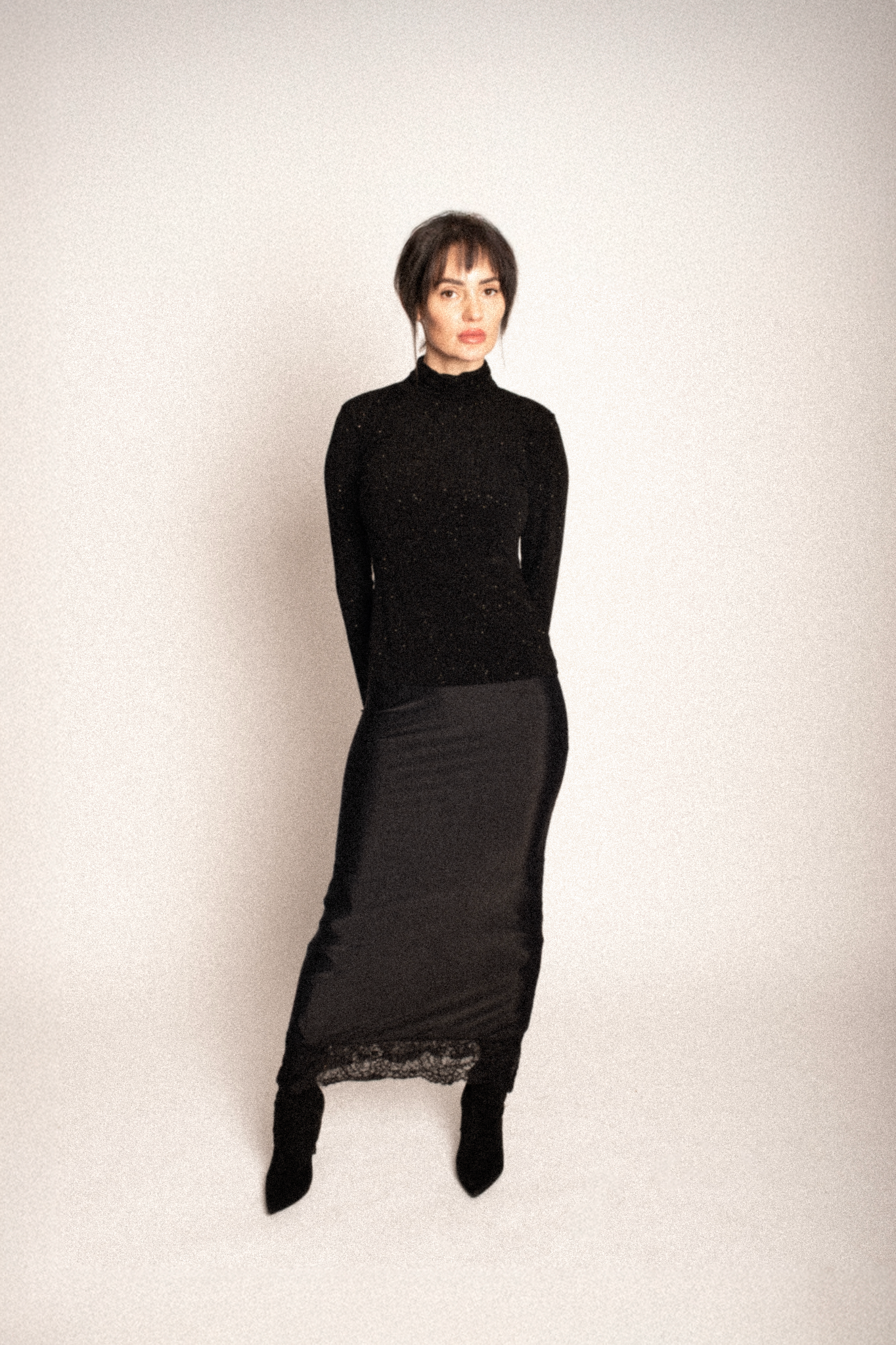 Stella fits true to size, has very high stretch and features long sleeves, turtleneck, and raw hems