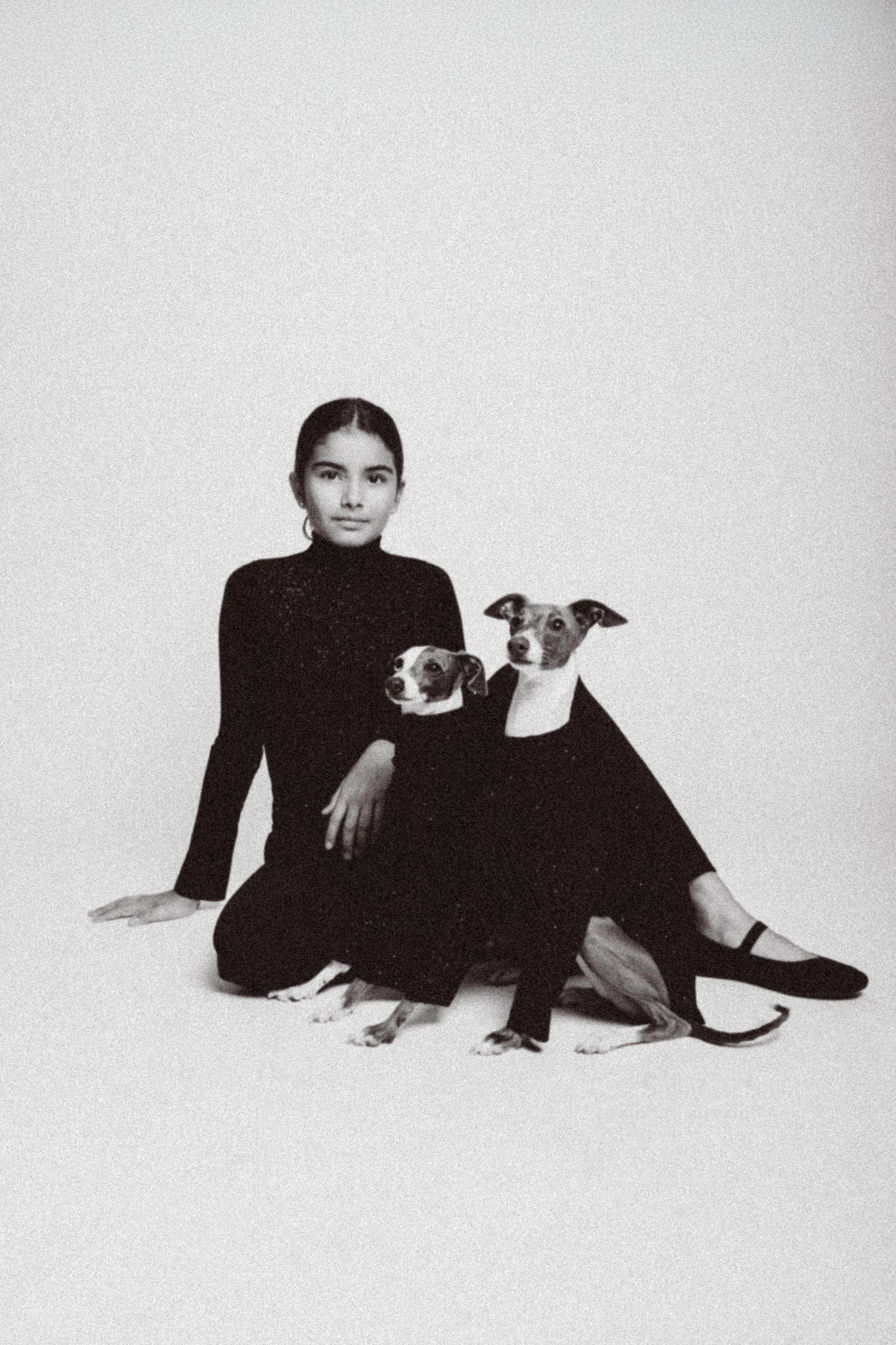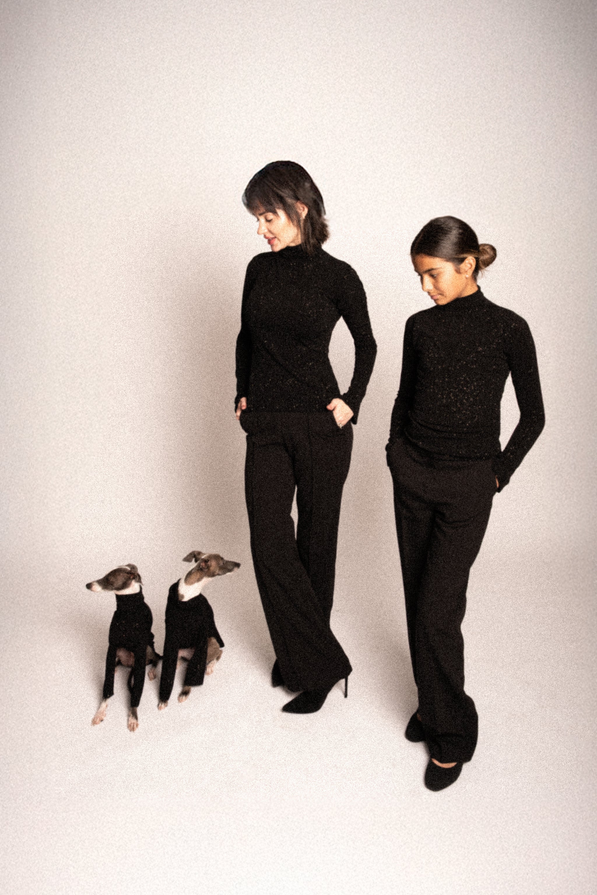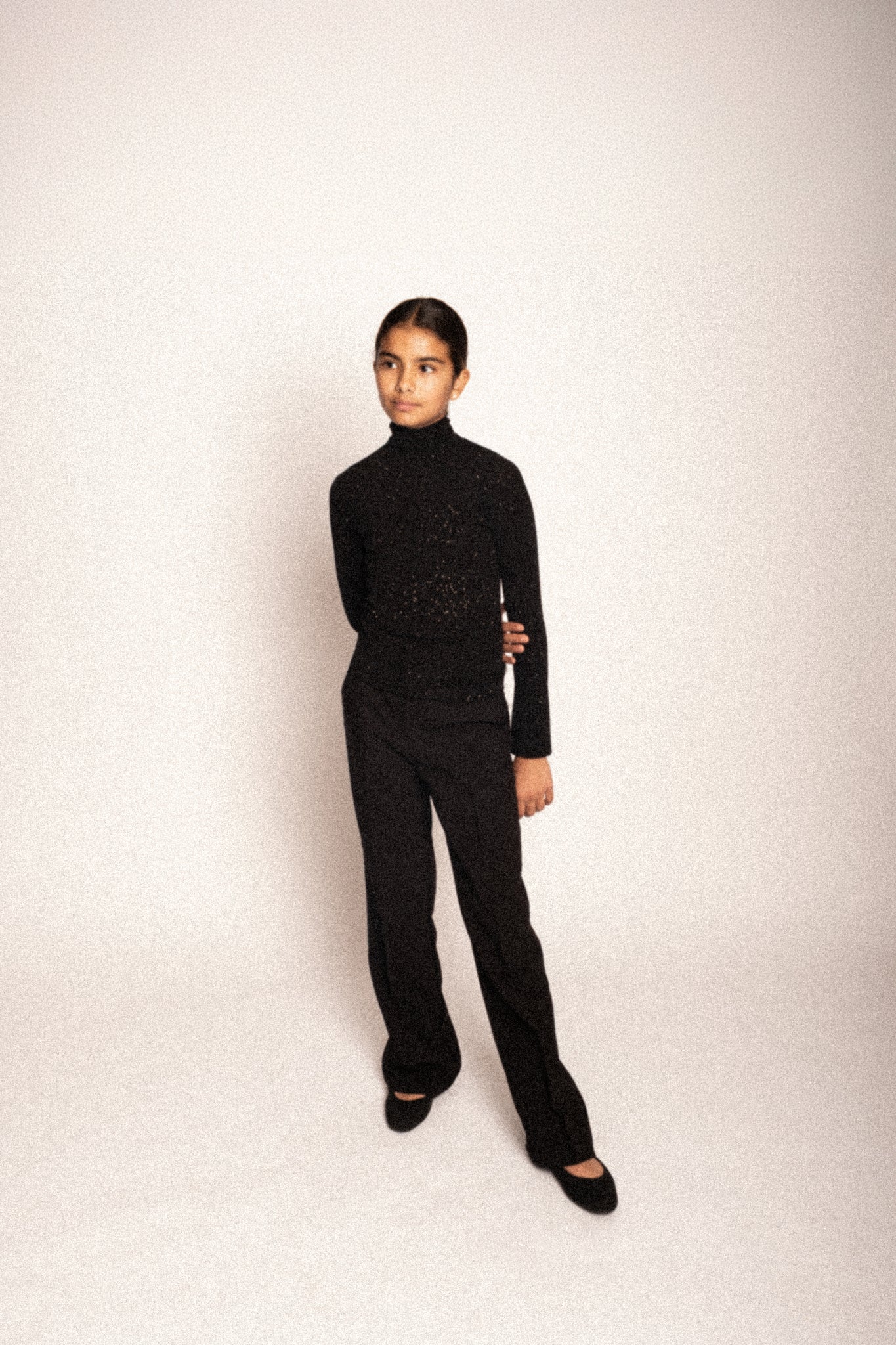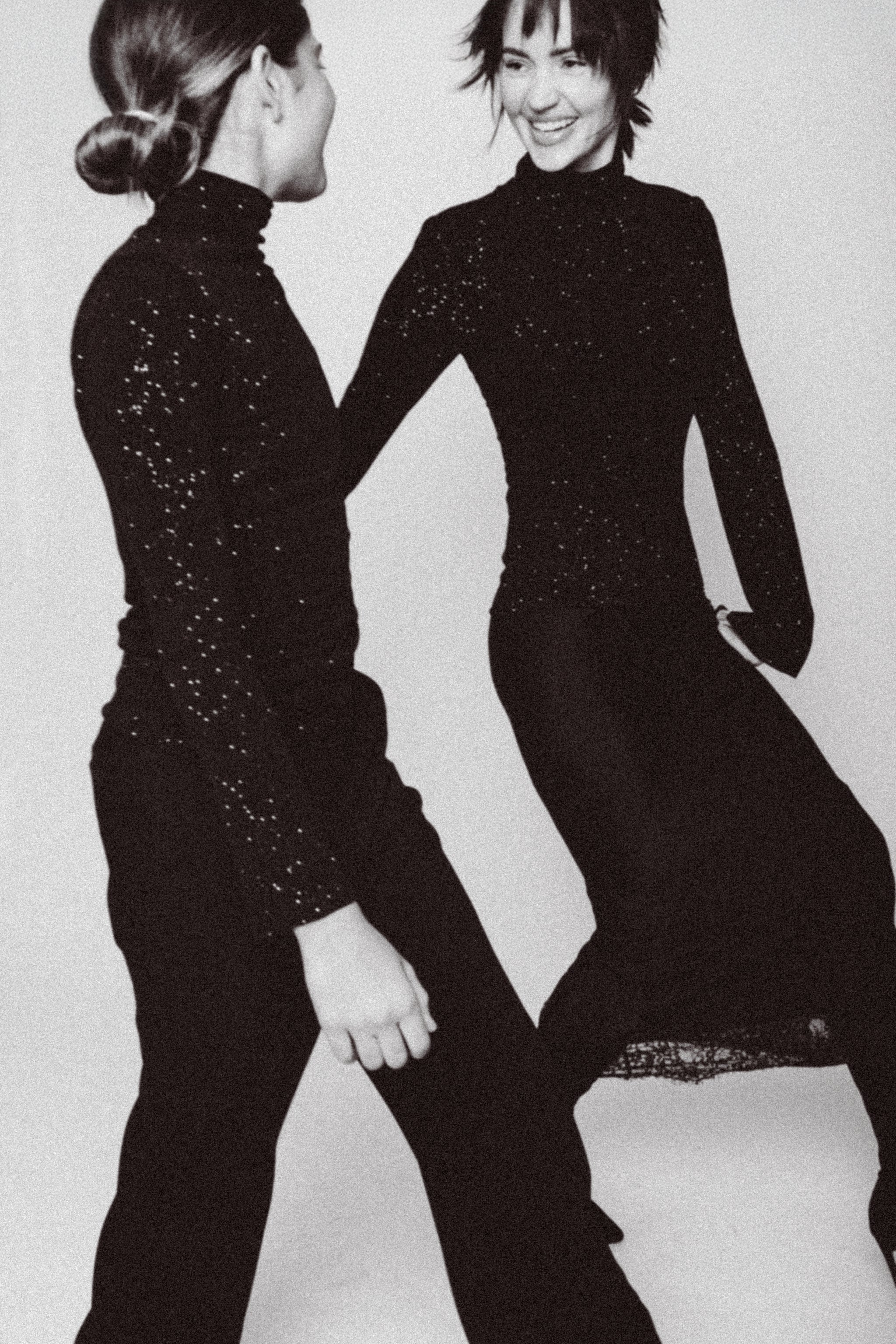 Stella fits true to size with a high amount of stretch. It features a turtleneck, long sleeves, and raw hems
